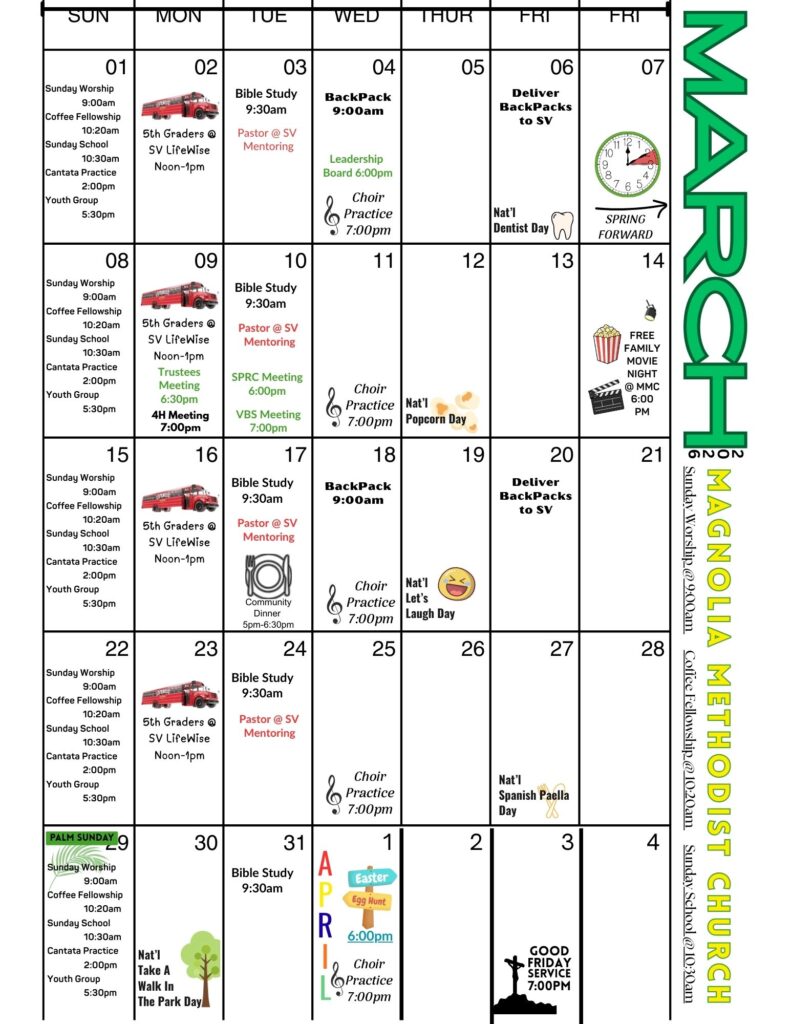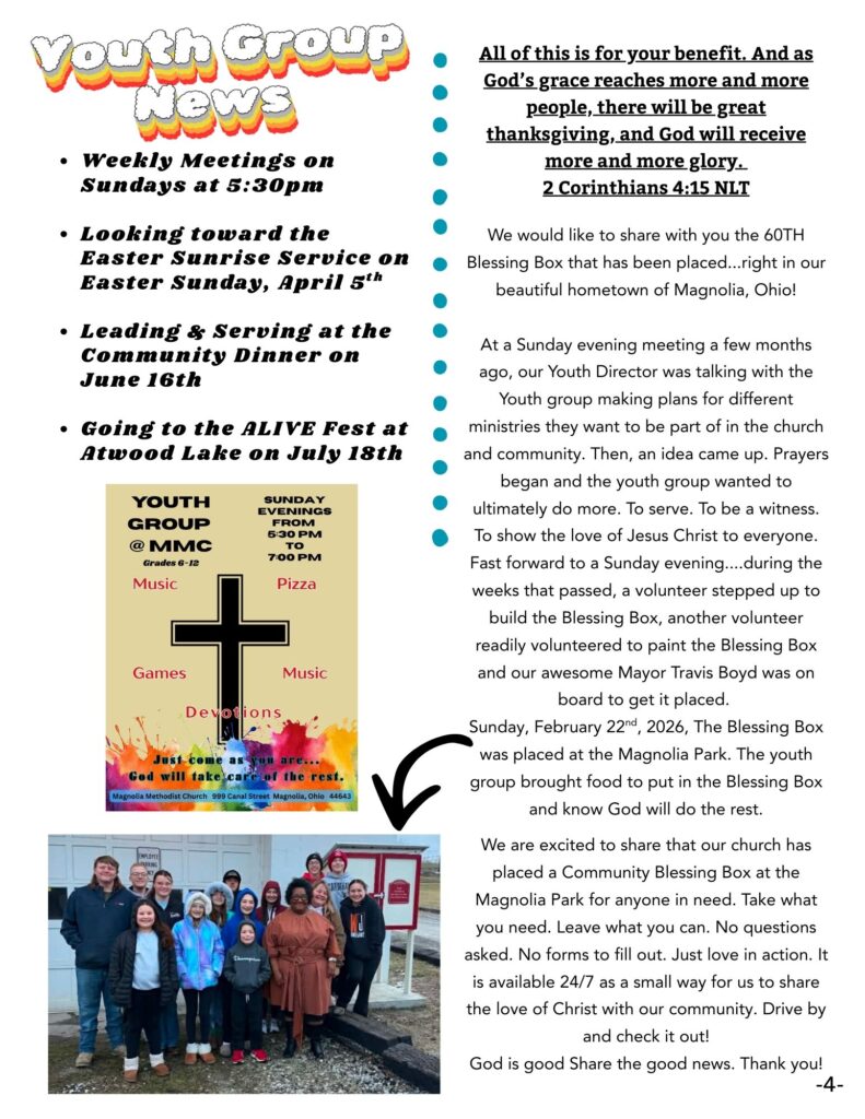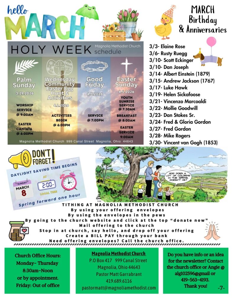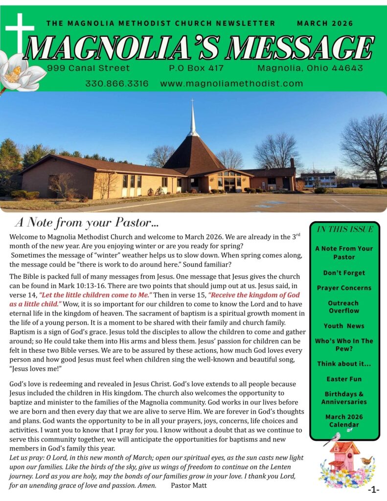 The Magnolia Message is a monthly newsletter that is published digitally and in paper form. If you would like a copy mailed to you, or a copy sent to your e-mail inbox, please notify the church office at admin@magnoliamethodist.com. We would be happy to send you a copy so that you can stay up-to-date on all of Magnolia Methodist Church’s activities and events.