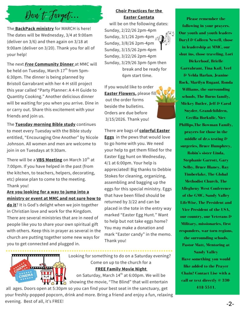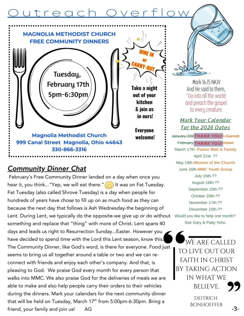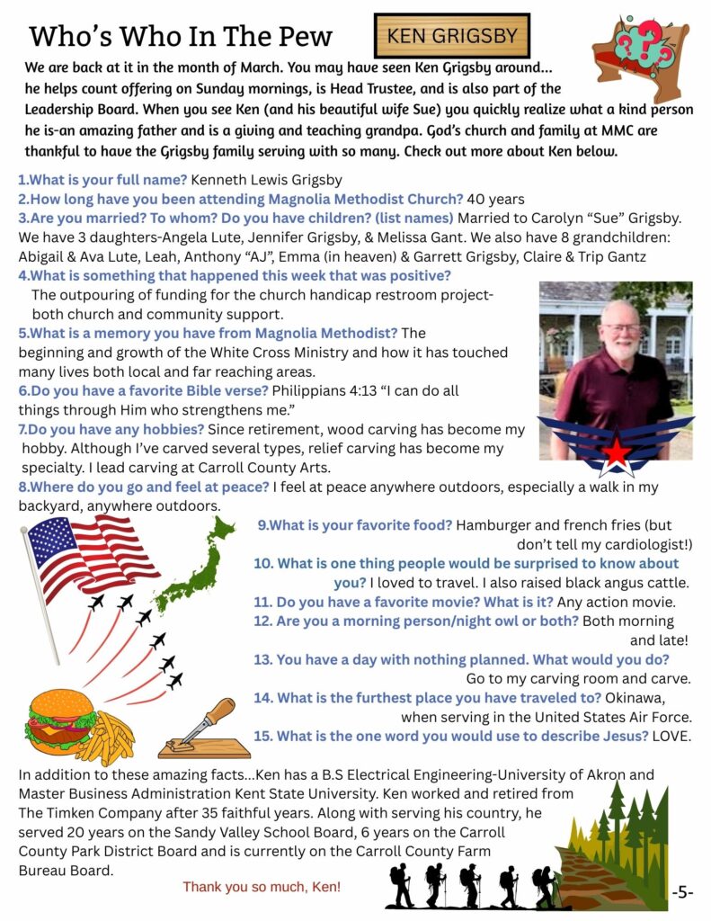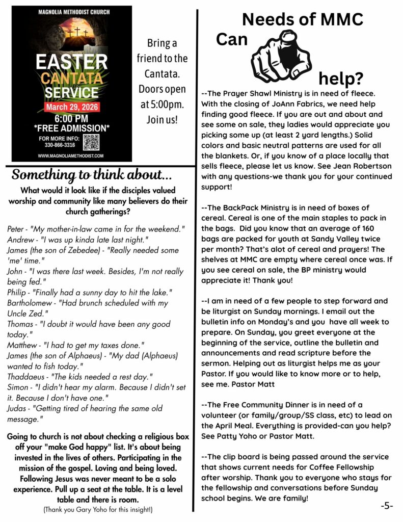The Magnolia Message is a monthly newsletter that is published digitally and in paper form. If you would like a copy mailed to you, or a copy sent to your e-mail inbox, please notify the church office at admin@magnoliamethodist.com. We would be happy to send you a copy so that you can stay up-to-date on all of Magnolia Methodist Church’s activities and events.